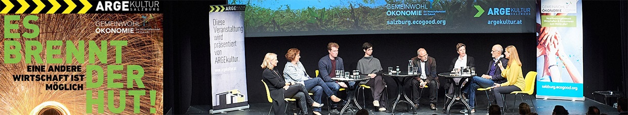 Nach dem großen Erfolg im letzten Jahr brannte auch heuer wieder der Hut: Die Regionalgruppe der Gemeinwohl-Ökonomie (GWÖ) Salzburg lud Mitte Mai in Kooperation mit der ARGEkultur Salzburg – sie ist der erste GWÖ-zertifizierte Kulturbetrieb – zur Podiumsdiskussion Es brennt der Hut Vol. 2 ein. Neben Toni Innauer (IXSO-Biogetränke) und Christine Miedl (Sparda-Bank München eG) bereicherten mit Alexandra Schmidt (Stadt Salzburg), Victoria Haas (Buchbinderei Fuchs), Reinhard Weinmüller (St. Virgil) sowie Phil Zezula (academy Werbeagentur und Bar) vier weitere erfahrene Praktiker*innen den Abend. Die gute Stimmung und das große Interesse sowohl am Podium als auch im Publikum führten dazu, dass die Veranstalterinnen und Moderatorinnen des Abends Sabine Lehner und Isabella Klien bereits einen Termin für Es brennt der Hut Vol. 3 fixiert haben.